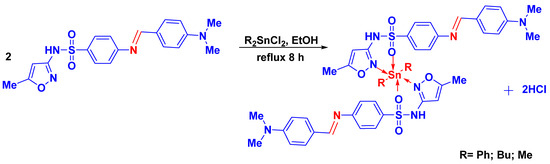 Complexes were prepared using a molar ratio of 1:2 (organotin). Appropriate amounts of Ph2SnCl2 (3.438 g, 0.01 mol), Bu2SnCl2 (3.038 g, 0.01 mol), and Me2SnCl2 (2.197 g, 0.01 mol) were each dissolved in 5 mL of methanol. Following that, these solutions were added to a stirred solution of L (sulfamethoxazole with 4-dimethylaminobenzaldehyde) (5.06 g, 0.02 mol) in 5 mL of ethanol; this blend was refluxed for 8 h. The final solution was filtered, heated to dry, and recrystallized to form precipitates, as illustrated in Scheme 2. Furthermore, Table 1 shows the physical properties of the synthesized sulfamethoxazole tin complexes.