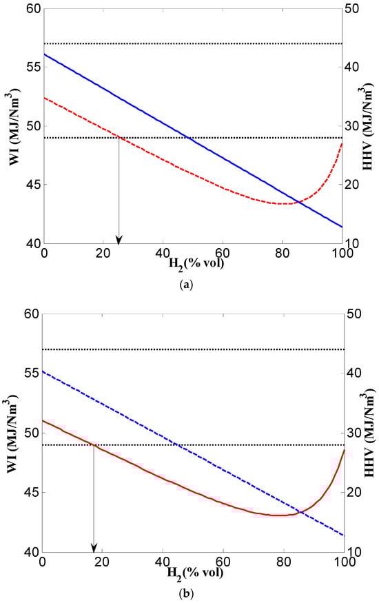 Wobbe index (red solid line) and High Heating Value (blue dashed line) variations of hydrogen natural gases mixtures (a) ANG (b) MNG. Also shown is the legal threshold of WI [33] plotted in dotted line.