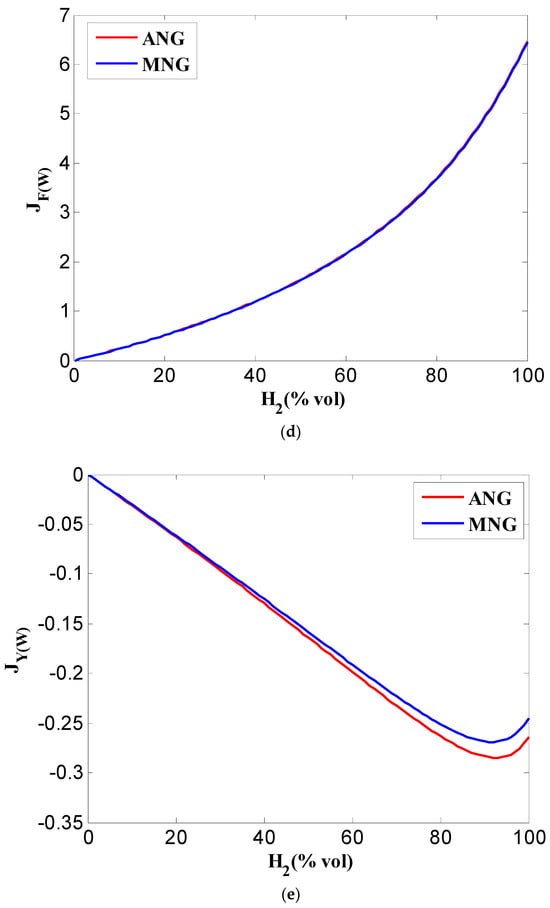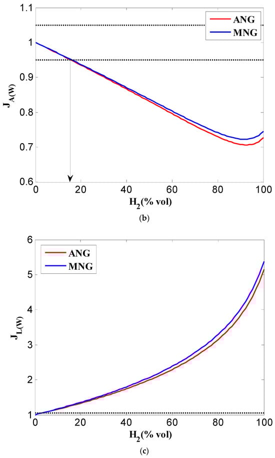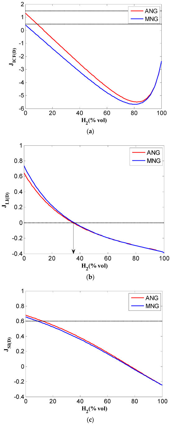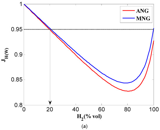 NG/H₂ mixtures are shown in Figure 4. Weaver’s index of interchangeability concerning the rate of heat production or release is illustrated in Figure 4a. The interchangeability condition is met when . Hydrogen content of 20% by volume represents the upper limit within the acceptable range for NG/H₂ mixtures for both ANG and MNG.