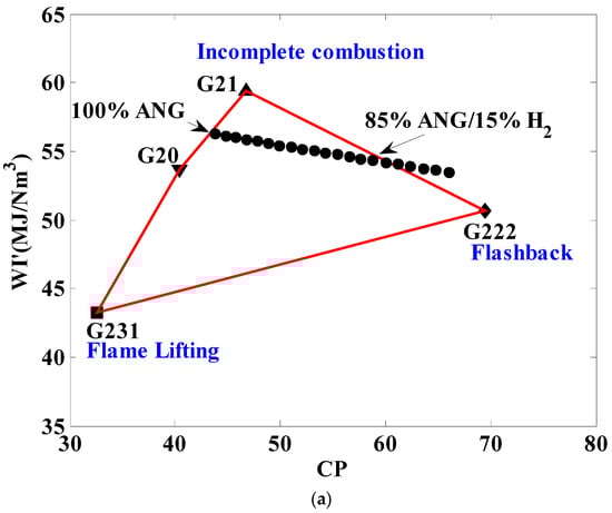 The corrected Wobbe Index variations as a function of combustion potential are plotted in Figure 3. In accordance with EN 437, four patterns representing the various reference gases (G20, G21, G222, and G231) used for gas quality and appliance requirements are also included in the graph to define the line-demarcated boundaries of the interchangeability area. Each mixture, with an x% hydrogen content, is represented as a point on the diagram. If the calculated coordinate value of the substitute gas falls within this area, the gas is classified as interchangeable with the base gas (100% NG). The reference gases characteristics, including composition, Wobbe Index (WI), combustion potential (CP), and tested limits, are detailed in Table 3.
