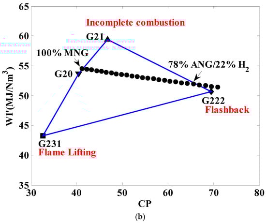 The stability and speed of combustion (i.e., flame lifting and flame flashback) are associated with the combustion potential parameter (CP). The evaluated gas type, as well as the composition and relative specific weight of the tested gas, all influence the final CP value. The following provides the mathematical expression of CP [31]: