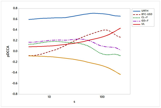 Figure 2 shows the DCCA coefficient between HYDR and the other assets (URTH, BTC-USD, CL=F and GD=F) for the period analyzed. The ordinate axis represents the values and the abscissa axis represents the time scale s, in days. The lines remain red and orange representing the significance test of [42].