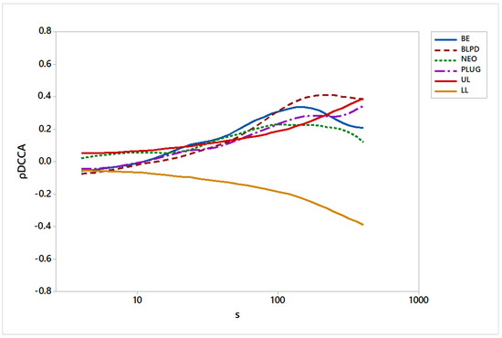 In this article, we used the Detended Cross-Correlation Analysis Coefficient (DCCA) method [16], that was created to evaluate the cross-correlation power laws between two simultaneous and non-stationary time series. This approach combined DCCA [14] and Detented Fluctuation Analysis (DFA) [15] to construct what quantifies the cross-correlation between two asymptotically non-stationary series. The values vary between −1 and 1. When this value equals to 1, the series are perfectly correlated, when it is −1, the series are anti-correlated, and it is zero when there is no correlation. Wang et al. combined DCCA and random matrix theory to investigate the cross-correlations of daily closing prices of 462 constituent stocks in the S&P 500 index [17].