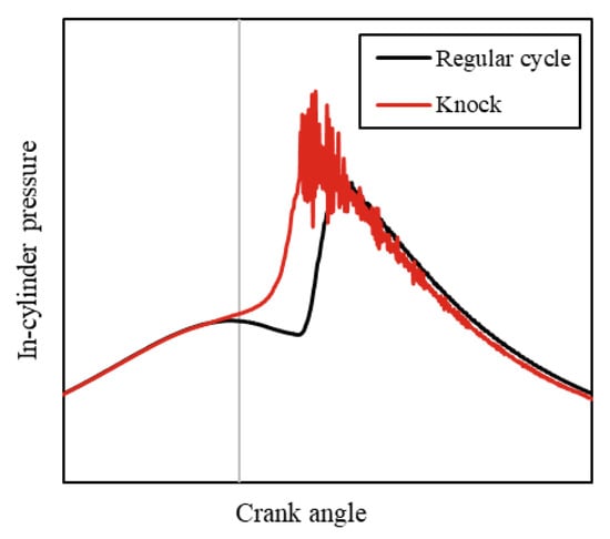 When knocking occurs, the end-gas (unburned air–fuel mixture in front of the flame front) is heated up by the pressure and temperature front until the mixture auto-ignites. The fast heat release leads to pressure waves that interfere and reflect, which is visible as a high-frequency pressure signal during the expansion stroke [7,8].