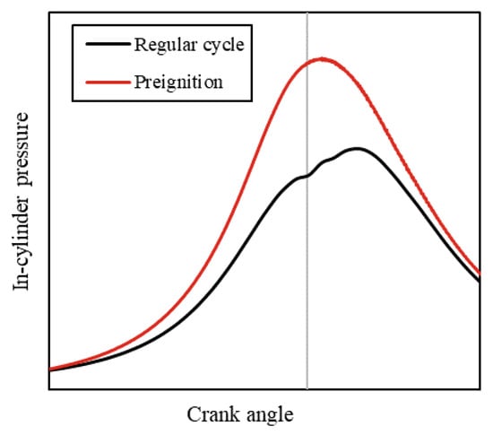 Local ignitions occur sporadically with no externally detectable history. The pressure curve resembles combustion with early ignition timing. Potential triggers are mixture inhomogeneities, deposits detaching from the cylinder wall, and oil droplets or particles that ignite the mixture [7,8]. An example of a preignition cycle compared to a regular cycle is shown in Figure 2. Within the research, spontaneous preignitions happened both at low and high load when reaching a critical hydrogen energy share. However, at low load, these were not considered harmful, as they did not lead to critical pressure in the cylinder. On the other hand, at high load, this increase in pressure level is indeed critical.