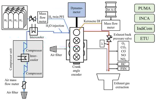 The investigations were conducted on an Austro Engine AE330 on a dedicated test bench at the Institute of Powertrains and Automotive Technology (IFA), Vienna University of Technology (TU Wien). Table 1 provides an overview of the engine’s specifications. A schematic overview of the engine test bench setup is shown in Figure 4.