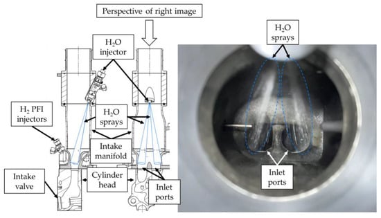 The injector used for water injection is a Bosch Motorsport EV14 injector (0 280 158 117). The slightly angled ‘down’ dual cone spray pattern enables precise and uniform distribution across the two inlet ports, resulting in minimized wall wetting and the best possible transportation of water into the combustion chamber. A CAD drawing of the WI-setup as well as a picture of the injected water into the inlet ports is shown in Figure 5. Distilled water was used to prevent limescale deposits and blockages.