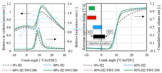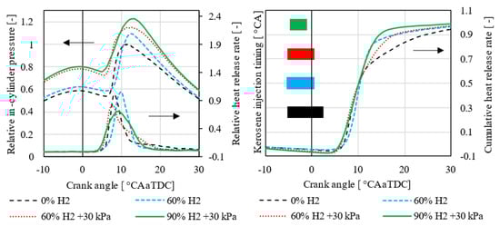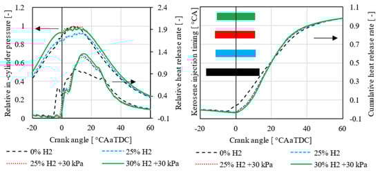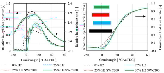Relative in-cylinder pressure and heat release rate (left) as well as relative cumulative heat release rate (HRR) and kerosene injection signal (right) as a function of the crank angle at constant 1690 RPM, 1 MPa IMEP, and constant combustion phasing—standardized on the basis of pure kerosene operation (0% H2).