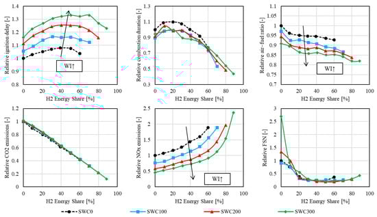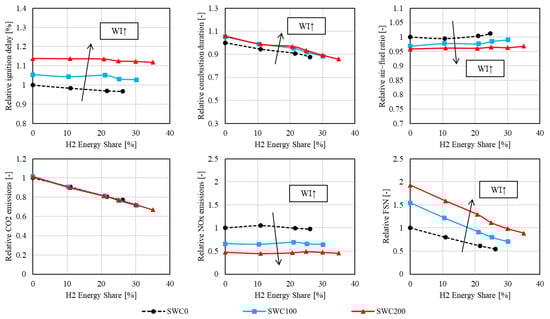 Figure 7 illustrates the effect of hydrogen and water injection on combustion characteristics and emissions. The ignition delay generally rises as hydrogen is added, due the altered heat capacity ratio and the reduced partial pressure of oxygen owing to the presence of gaseous fuel (H2) [23,24]. At high hydrogen energy fractions, it is assumed that the high flammability of hydrogen becomes more significant, ultimately resulting in a reduced ignition delay. In general, water injection prolongs the ignition delay due to slowed down reaction rates associated with the lower temperatures.