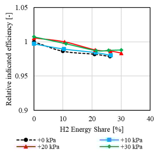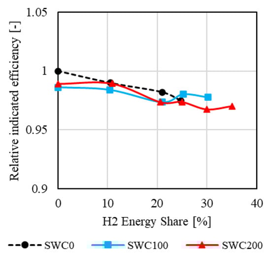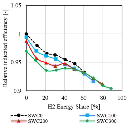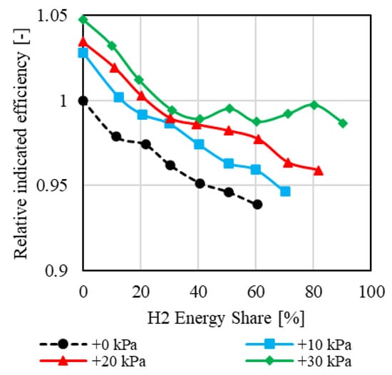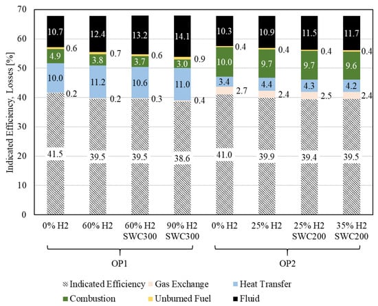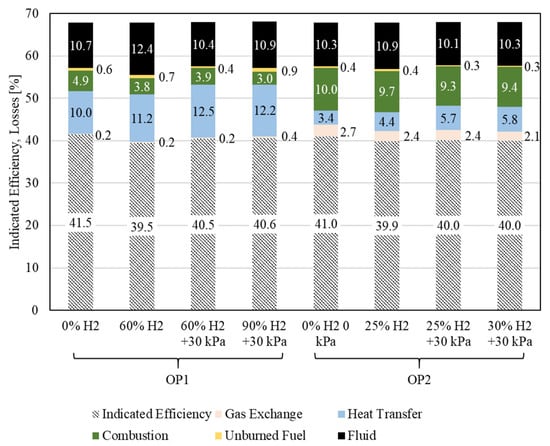 Overall, the indicated efficiency decreases at the maximum hydrogen energy share, which is achieved through water injection for both operating points. This reduction is primarily due to the increased fluid losses.