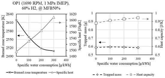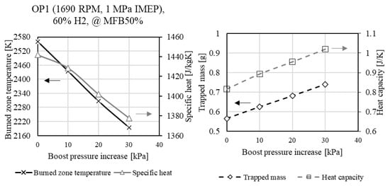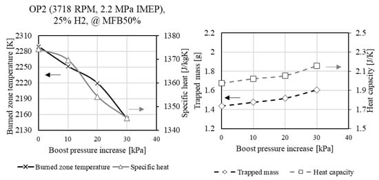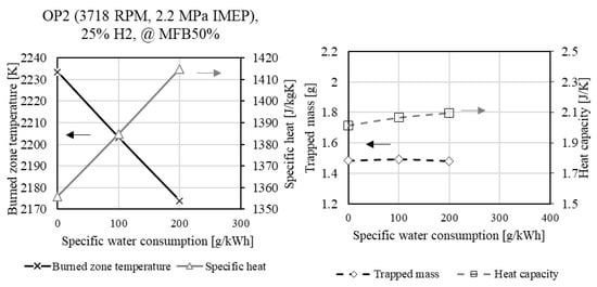 In Section 3, the experimental results are complemented by simulation data, including the burned zone temperature of the considered two-zone model, the specific heat, the trapped mass, and the heat capacity. The values were extracted and plotted at the respective MFB50%.