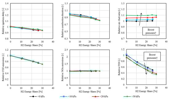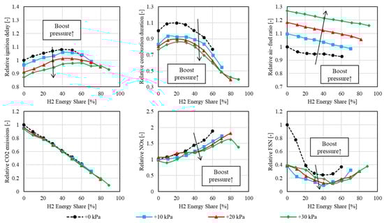 Increasing boost pressure, thus increasing the air–fuel ratio (AFR), also has some considerable effects on the combustion. Firstly, with further dilution of the air–fuel mixture, the heat capacity is increased, which leads to lower combustion temperatures. Still, increased boost pressure also results in higher compression pressures and, hence, an overall higher temperature in the combustion chamber. In this manner, negative findings were reported, e.g., Nagalingam et al. [12] and Berckmüller et al. [13].