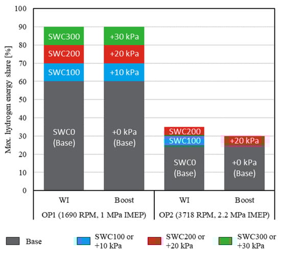 In terms of the maximum hydrogen energy share, both investigated strategies lead to significant improvements, whereas water injection has slightly higher benefits at high load. The H2 energy share increased from 60% to 90% for low load (OP1) and from 25% to 35% for high load (OP2) with the addition of water. Increasing the boost pressure results in maximum hydrogen energy shares of up to 90% for OP1 and 30% for OP2, however, this is limited by the maximum allowable pressures.