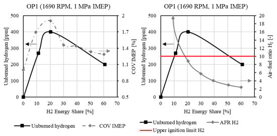 At the low load point (OP1), there is no noticeable improvement in combustion with increased boost pressure. However, similar to the scenario with water injection at a higher hydrogen rate, the beneficial combustion properties of hydrogen are evident. At the high load point (OP2), an improvement in combustion losses due to boost pressure increase is noticeable. This can be attributed to the slight reduction in combustion duration shown in Section 3.2. The further increase in hydrogen from 25% to 30% ultimately has a negligible impact on combustion losses.