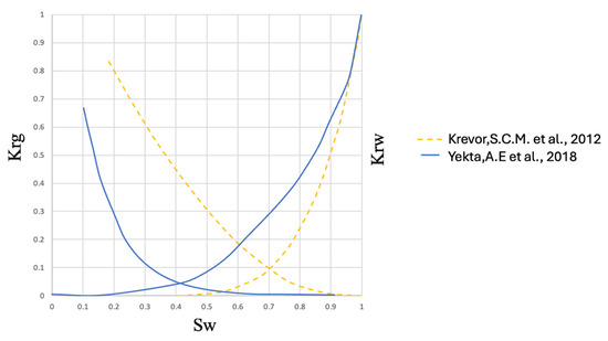 Relative permeability curves applied for this study [45,46].