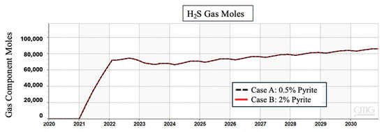 A minimum volume fraction of (0.5%) of pyrite and a maximum of 2% were both implemented as the only different factors in two duplicated scenarios to assess the impact of pyrite concentration on the generation of H2S. Our results revealed that the concentration of pyrite was not an influential factor in decreasing or increasing the level of H2S formed in the reservoir. Figure 3 is a comparison of the H2S formation over the years for both scenarios.