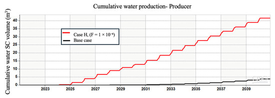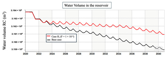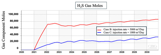 Although the volume of pyrite was different, the changes in the mineral’s mole and the amount of H2S formed were the same. Hence, we simulated other scenarios where the amount of the injected hydrogen varied, and therefore, the amount of dissolved hydrogen that would react with pyrite would be different. In the initial scenario, the injection rate remained consistent at 5000 m3/day, whereas in the subsequent scenario, the injection rate was reduced to 1000 m3/day. Our results showed that the total volume of injected hydrogen has a major influence on the amount of H2S generated, as seen in Figure 4.