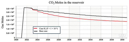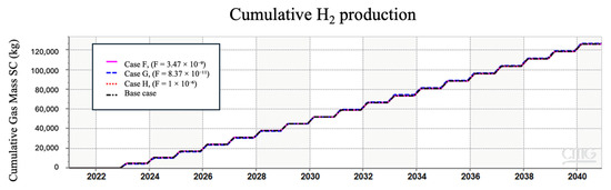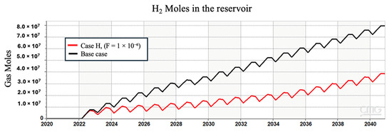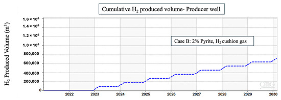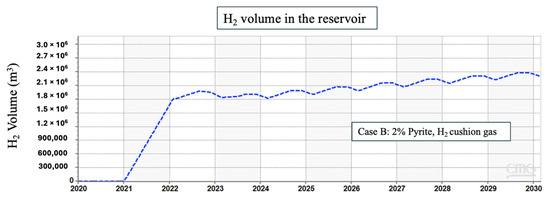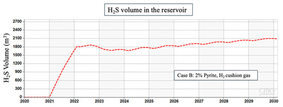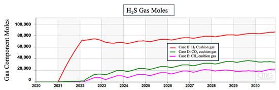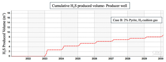 The presence of reactive impurities, such as CO2, may alter the chemical environment and limit some reactions as a consequence. When CO2 dissolves into brine, it forms carbonic acid, which then dissociates into bicarbonate and hydrogen ions, leading to an alternation in the pH of the system towards a more acidic environment [50]. Although the lower pH can create a stable condition for the pyrite reduction to thrive, the use of CO2 as a cushion gas may alter the expected results. The strategic deployment of cushion gas denser than hydrogen, such as CO2 and CH4, facilitates the establishment of a confined spatial domain to contain the hydrogen in the reservoir, thereby constraining the lateral spreading of hydrogen molecules. This containment strategy effectively restricts the interaction of hydrogen with the minerals in the formation because it reduces the surface area for the minerals to interact with hydrogen. Hence, in the case of using a cushion gas other than hydrogen, there is less surface area of pyrite to interact with hydrogen, and consequently, the generation of H2S is decreased. The influence of cushion gases on hydrogen plumes and lateral spreading is discussed in detail by Al Homoud et al. [51,52]. Figure 5 in our results presents a comparison of H2S production in three scenarios where the cushion gas was hydrogen, methane, and carbon dioxide, respectively.