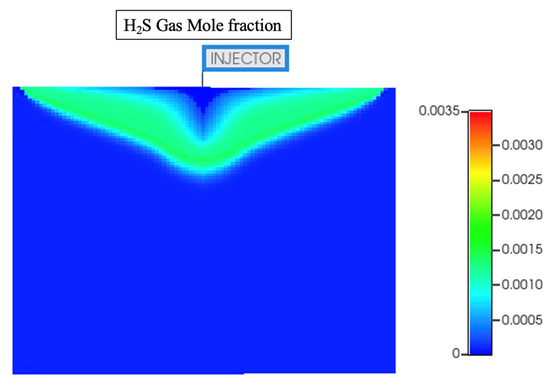The source of hydrogen sulfide in underground hydrogen storage is the presence of sulfur-containing minerals in the rock formations. The most important mineral, and the one known for its reactivity, is pyrite (FeS2). The literature suggested the presence of minor quantities of this mineral. However, this mineral is highly reactive with hydrogen gas. Hydrogen acts as a reducing agent by donating electrons to the pyrite, and pyrite acts as the acceptor of electrons and, therefore, undergoes reduction, leading to the production of iron (Fe) and hydrogen sulfide (H2S). Reaction (4) is taken into account in our numerical simulation to quantify the formation of H2S within the hydrogen storage system.