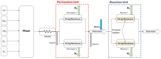 The test started by flowing N2 into the plant at 4 bar, followed by the gradual heating of membrane units, with steps of 50 °C up to 300 °C. Then, the Pd-Ag membranes were activated, feeding 10 g·h−1 of H2. In both permeation and reaction units, the integrity of the membranes and their hydrogen selectivity were verified using leak tests. These tests involved pressurizing the membrane with nitrogen and confirming, through GC analysis, the absence of any nitrogen flux in the permeate stream. The syngas mixture was prepared with the support of GC analysis to verify the concentrations, and the test began. At each experimental point, six to eight measurements of the retentate composition were performed at intervals of 10 min; the values were then averaged for data analysis. Correspondingly, measurements of pressure, temperature, mass flows, and permeate volumetric flow were recorded. More details about the test plant and experimental procedures are reported elsewhere [30].