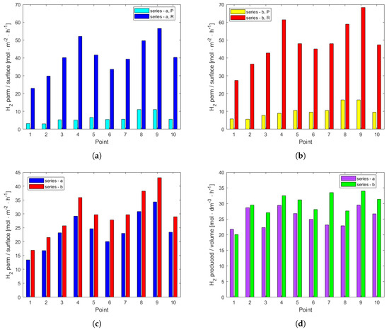 (a) Permeation of H2 per unit of surface and time divided per permeation unit (P) and reaction unit (R) for series a. (b) Permeation of H2 per unit of surface and time divided per permeation unit (P) and reaction unit (R) for series b. (c) Overall H2 molar flow rate permeated per unit of surface and time. (d) H2 produced in the reaction unit per unit of catalyst volume and time.