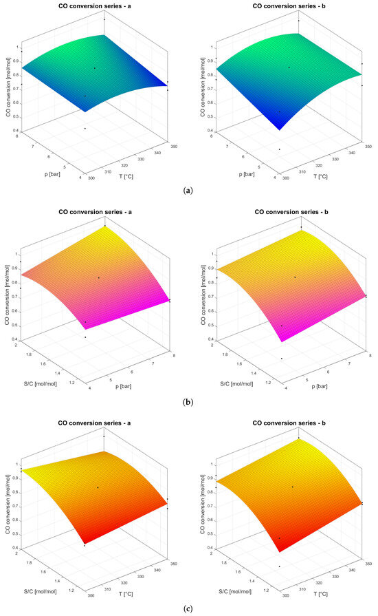 Impact analysis of temperature, pressure, and S/CO for series a and series b. Black dots are the experimental data. (a) CO conversion ratio versus temperature and pressure. (b) CO conversion ratio versus pressure and S/CO. (c) CO conversion ratio versus temperature and S/CO.