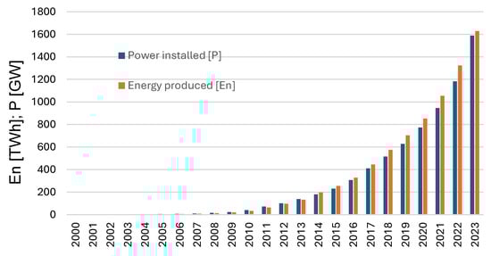 Figure 1 illustrates the recent growth in global photovoltaic (PV) installations, showing both the energy generated (in TWh) and the installed capacity (in GW). By the end of 2023, according to GSR data [