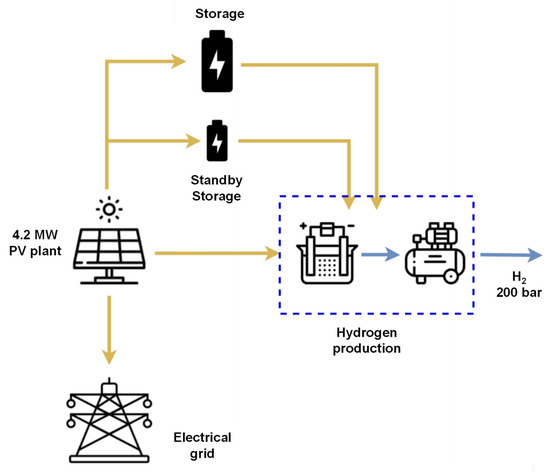 Figure 2, which integrates photovoltaic generation with hydrogen production and the electric grid, is viable primarily if most of the energy generated by the PV system is dedicated to the hydrogen supply chain. Given the current market price of hydrogen, the plant conceptually makes sense only if hydrogen production is the dominant outcome, with minimal energy diversion to the grid. A definitive assessment, however, will require an economic analysis to validate the plant’s feasibility under real-world conditions.