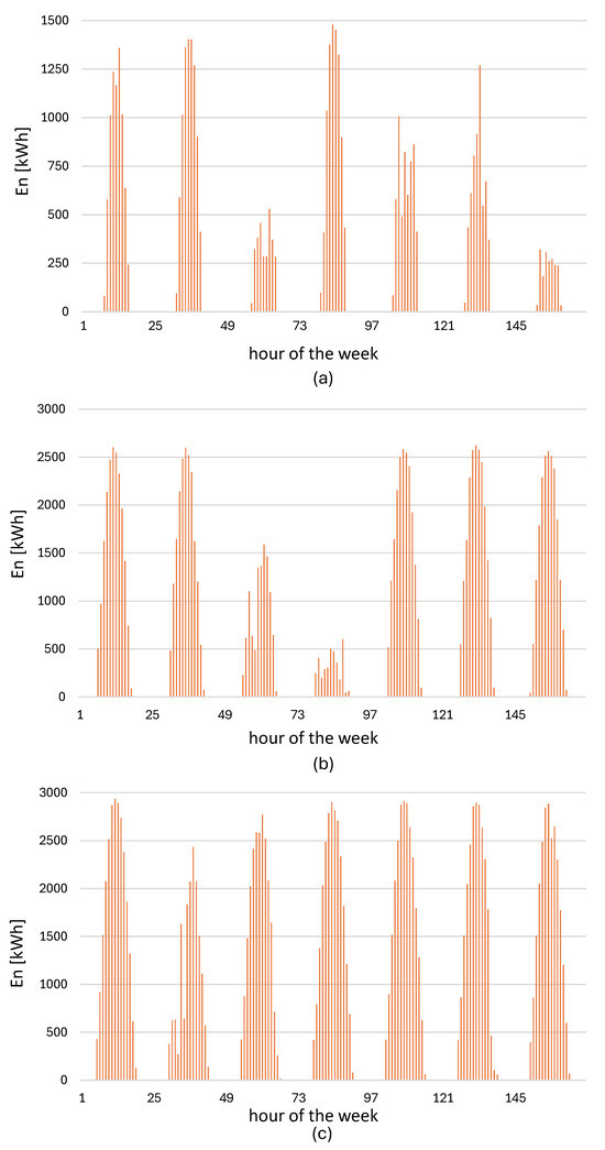 Figure 3 shows three realistic weeks, one in winter (a), one in spring (b), and one in summer (c), consisting of alternating beautiful days and worse days. As can be observed, on many days throughout the year, the power production of the plant exceeds the capacity of the electrolyzer. In different cases, corresponding to many winter days and certain days with unfavorable weather conditions during intermediate seasons, the power generated by the photovoltaic system is not sufficient for the direct activation of the electrolyzer.