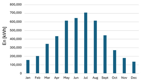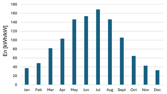 Figure 5 provides a specific production, considering the energy produced for each month for the unit value of the peak power installed (1 kW). From a conceptual standpoint, the trends shown in the following figures are similar, although they offer valuable insights into some quantitative details, providing a clear understanding of the plant’s performance both in total and on a per-unit basis. The logic of the system operation prioritizes hydrogen production and sending energy to the grid only when there are production surpluses, and the electrolyzer operates at nominal power and storage is full. The electrolyzer operates at four discrete power levels: 25% of nominal power, 50% of nominal power, 75% nominal power, and full nominal power. No intermediate operating ranges are allowed.