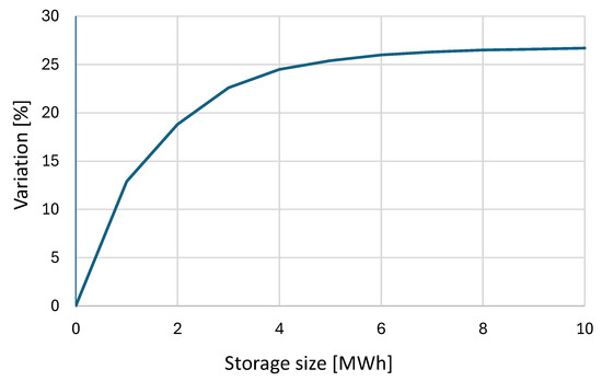 Figure 6 for the 2 MW electrolyzer case, such an increase does not result in significant improvements in hydrogen production levels. Increasing the size of the storage system, even up to 4 MWh (a size that is equivalent to the maximum hourly photovoltaic energy production), does not yield any significant energetic benefits.