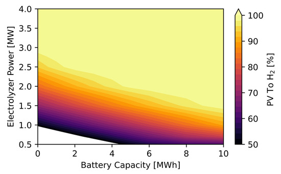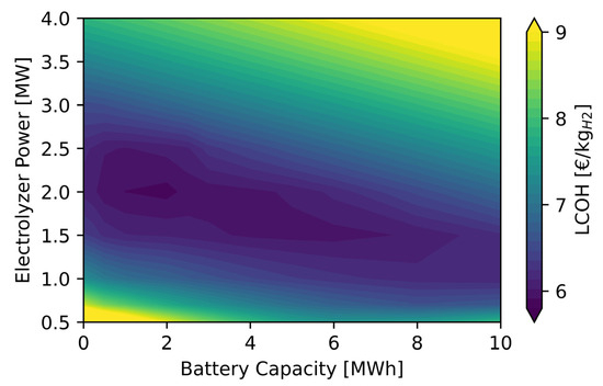 Figure 7 illustrates the heat map of LCOH as a function of electrolyzer and battery storage size. It can be observed that when the electrolyze size is minimal, a larger battery can be a cost-effective solution.