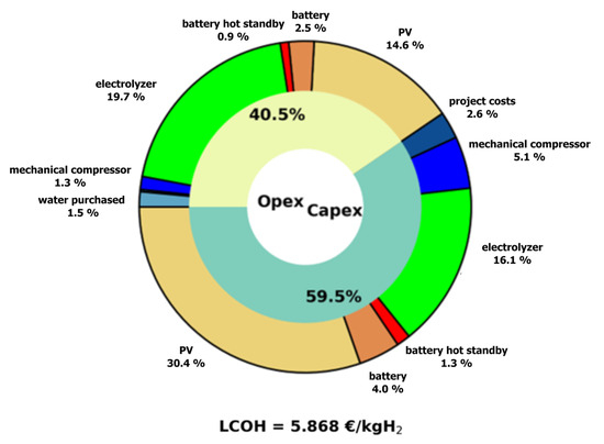 Figure 9 represents the contributions of each component and technology to the composition of LCOH. It is evident that the PV system and the electrolyzer represent the primary contributors to the total cost. PV impact is about 45%, of which 30.4% is for CAPEX and 14.6% is for OPEX, while electrolyzer impact is 35.7%, of which 16.1% is for CAPEX and 19.7% is for OPEX.