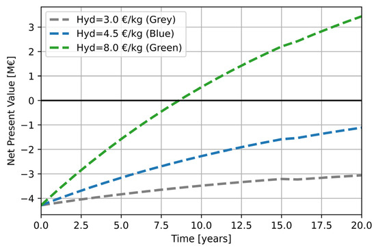 The NPV is very sensitive to the selling price of energy vectors, particularly that of hydrogen. Consequently, we have examined three distinct price scenarios to assess the impact of substituting hydrogen produced from natural gas with or without carbon capture (referred to as blue or grey hydrogen, respectively) or hydrogen from renewable plants (green hydrogen).