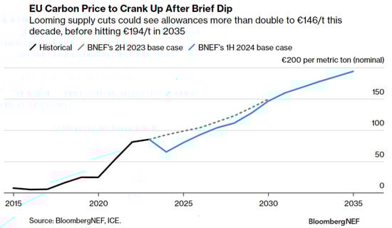 22]. It is worth mentioning that the price of EU emission allowances is expected to dip to an average of EUR 65 per metric ton (USD 70/t) this year before more than doubling to EUR 146/t by the end of the decade. Prices could approach the EUR 200/t milestone in 2035 if policy parameters remain unchanged (see