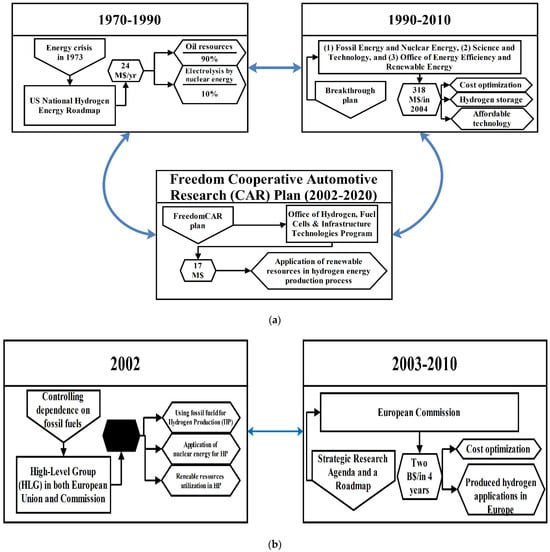 As per Figure 6a, it can be seen that in the USA, policies have been based on the use of fossil fuels as the raw material for hydrogen energy production. This is despite the fact that after several years of exploitation and development of the mentioned clean energy, approaches have changed and the volume of investments has increased more than tenfold in the second ten years. At the same time, in Europe, large investment has been made in the production of hydrogen energy from the beginning, and the focus has been on evaluating new applications of this renewable resource in society (Figure 6b). Finally, in China, the main investments were focused on technology development for using hydrogen energy in transportation systems (Figure 6c).