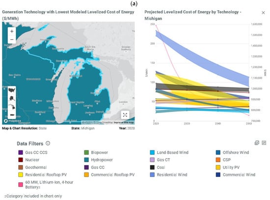 Michigan’s approach to hydrogen strategies reflects its industrial heritage and economic goals, which are centered on diversifying energy sources and ensuring resilience. Figure 11a [66] highlights Michigan’s emphasis on cost-competitive energy generation technologies, including wind and nuclear, alongside advancements in hydrogen production. The state’s energy plan integrates hydrogen as a means to connect sustainable fuel production with economic productivity, particularly in manufacturing and transportation sectors. Michigan’s energy crisis mitigation strategy includes reducing dependence on coal and fossil fuels while leveraging hydrogen for industrial applications. Unlike California, Michigan’s focus extends to creating synergy between hydrogen adoption and green technology manufacturing, ensuring long-term sustainability. Investments in hydrogen are also seen as a pathway to position Michigan as a leader in clean energy technology, promoting job creation and industrial competitiveness.
