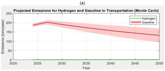 The Monte Carlo simulation methodology projects future emissions and market shares for hydrogen and gasoline vehicles from 2025 to 2050, using 10,000 simulations to account for uncertainty. The initial market shares are set at 5% for hydrogen and 95% for gasoline. Emissions are modeled based on the mean and standard deviation values as follows: hydrogen emissions decrease slightly, while gasoline emissions increase over time. Growth and decline rates are randomly sampled from normal distributions, with hydrogen growth set at 5% (±1%) per year and gasoline declining by 2% (±1%) annually. For each year, market shares are updated, and emissions are calculated based on these shares. The results, averaged over all simulations, show that hydrogen vehicles will capture around 30% of the market by 2050, with near-zero emissions. Gasoline market share declines to 60%, though emissions remain higher. The model provides foresight into the potential market transition, emphasizing hydrogen’s role in reducing transportation-related emissions [47]. All computations are executed in MATLAB 2019b [48] software.