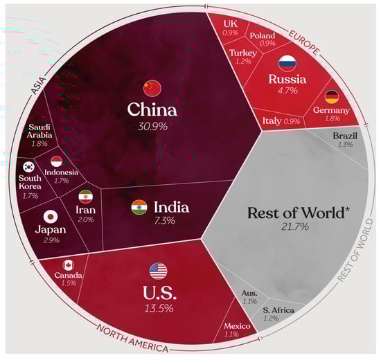 The global population, currently estimated at around 7.5 billion and expected to reach 8.5 billion by 2030, continues to drive rising demands for energy consumption [1,2]. Fossil fuels, including coal, oil, and natural gas, account for the majority of energy production and usage globally. However, the persistent burning of these fuels has significantly increased CO2 emissions into the atmosphere. Figure 1 illustrates the proportion of carbon emissions across different countries [3]. Elevated CO2 levels have sparked environmental concerns such as global warming, acidic rain, ecosystem degradation, deforestation, and climate change.