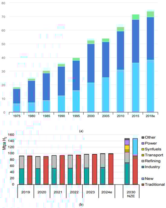 (a) Global demand for hydrogen from 1975 to 2018. (b) Global demand for hydrogen from 2019 to 2024.