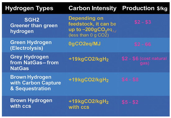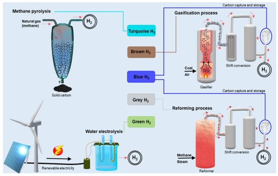 - Yu, M.; Wang, K.; Vredenburg, H. Insights into low-carbon hydrogen production methods: Green, blue and aqua hydrogen. Int. J. Hydrogen Energy 2021, 46, 21261–21273. [Google Scholar] [CrossRef]
