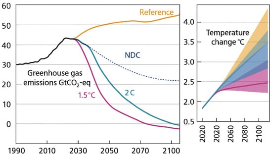 The Paris Agreement aims to achieve net-zero GHG emissions and limit global warming to below 2 °C. Projections indicate that global temperatures will likely increase by 1.5 °C by 2040, as depicted in Figure 4 [21], unless emissions are significantly reduced in the near future: “Global warming of 1.5 °C and 2 °C will be exceeded during the 21st century unless deep reductions in CO2 and other greenhouse gas emissions occur in the coming decades,” as stated in the IPCC report from August 2021 [22].