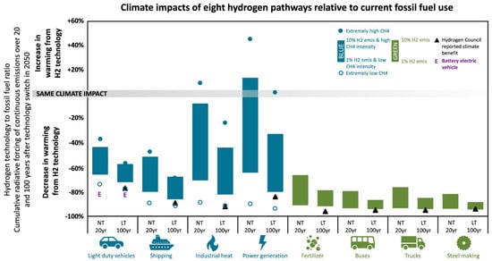 In Summary, hydrogen technologies can provide a more immediate climate advantage than fossil fuel-based solutions, achieving 92–95% efficiency in green hydrogen applications with minimal hydrogen emissions. However, higher emission rates can lessen these climate benefits, making hydrogen technologies 66–82% more environmentally friendly than fossil fuels over both short- and long-term periods. A 10% hydrogen emission rate could reduce the anticipated climate benefits of green hydrogen by up to 13% in the long term and up to 25% in the short term. The least favorable fuel-switching scenarios in high-emission conditions include replacing natural gas-derived fertilizer with hydrogen and substituting hydrogen fuel cell trucks for heavy-duty diesel internal combustion engine (ICE) trucks. Assuming relatively low methane emissions while excluding hydrogen emissions and near-term effects, across all scenarios, the best-case conditions characterized by minimal methane and hydrogen emissions demonstrate that hydrogen technologies can consistently achieve at least a 75% reduction in warming impacts compared to fossil fuel alternatives.