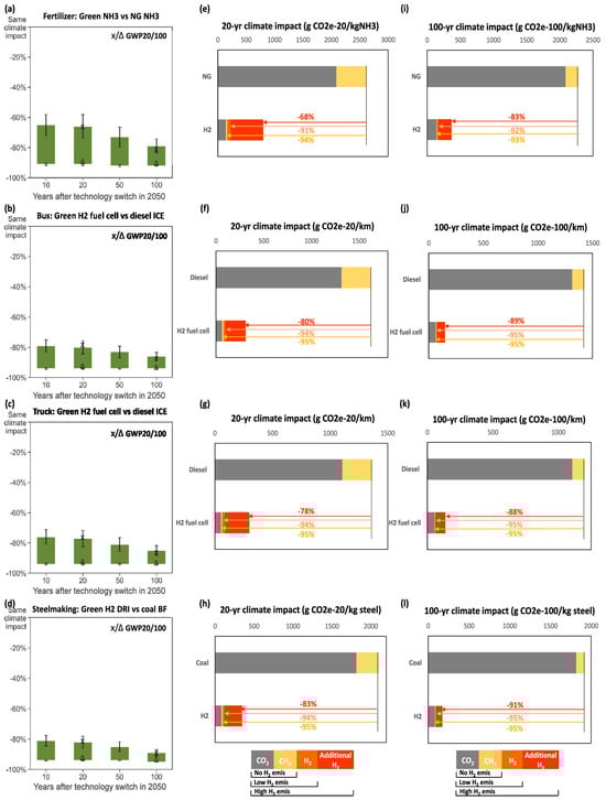 The climate impacts of four green hydrogen pathways in 2050 evaluated over their life cycles and compared to fossil fuel alternatives, accounting for hydrogen emission rates ranging from 1% to 10%. Panels (a–d) illustrate the percentage change in cumulative radiation resulting from continuous emissions over 10, 20, 50, and 100 years after adopting the technology. Panels (e–l) present the annual emissions per functional unit, such as kilometers traveled or kilograms of product produced, measured in CO2e over 20- and 100-year periods.