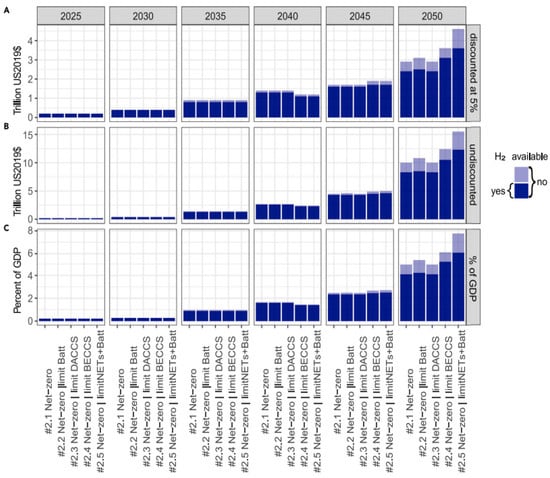 Figure 7 illustrates the discounted costs at a 5% discount rate (A), undiscounted costs (B), and costs as a percentage of GDP (C) of climate mitigation. In the stacked chart, the dark blue section represents costs when hydrogen is available, whereas the combined dark blue and light blue sections indicate costs in the absence of hydrogen. BECCS represents bioenergy with carbon capture and storage, DACCS stands for direct air carbon capture and storage, and NET+Batt represents nets and batteries [33]. The costs associated with achieving carbon neutrality increase over time across all scenarios, reaching between $8.3 and 12.3 trillion (in constant 2019 dollars) or approximately 4.1% to 6.1% of the global GDP by 2050, as depicted in Figure 7B,C. The most significant cost increase occurs between 2045 and 2050, as the final push toward carbon neutrality becomes more expensive than achieving low emissions. If hydrogen is not utilized (i.e., not converted into electricity, biofuels, e-fuels, or ammonia), the mid-century mitigation costs surge to $10.0–15.7 trillion (6.1–7.8% of global GDP), a 20–28% increase compared to hydrogen-based net-zero scenarios. The higher end of this range (28%) reflects minimal use of negative emissions technologies (NETs) and batteries. While hydrogen constitutes a relatively small portion of overall final energy demand (3–9% in 2050), these cost disparities may appear substantial initially. The rationale behind this is that in sectors difficult to electrify, hydrogen use could lead to significant cost savings. Notably, the hydrogen market is expanding in these areas, which suggests that its use helps reduce the high costs of pollution mitigation in sectors with limited alternatives. According to the scenario assumptions, the international shipping sector shows the greatest potential for hydrogen to reduce greenhouse gas emissions, offering the most significant overall cost reductions up to 6.4% in 2050 under this scenario. Following this, the heavy freight truck industry shows a 5.4% cost reduction, the residential building sector 2.4%, passenger vehicles 1.9%, cement production 1.7%, steel and iron production 0.7%, ammonia fertilizer production 0.3%, and chemicals 0.3% in 2050 compared to scenarios without hydrogen.