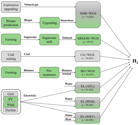 Figure 1 presents the main stages typically considered in life cycle assessments of hydrogen production pathways, which can be based on renewable (see green boxes) or non-renewable (see grey boxes) resources. The energy efficiency related to the hydrogen technology conversion were based on [48,49,50,51].