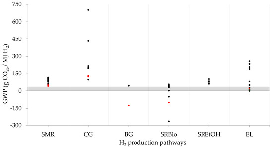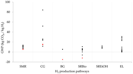 GWP of H2 production systems, mass relative. SMR: steam methane reforming; CG: coal gasification; SREtOH: steam reforming of ethanol; SRBiogas: steam reforming of biogas; BG: biomass gasification; EL: water electrolysis. Red points indicate technologies with CCS.