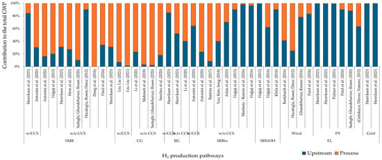 SMR is often used as a benchmark for comparing other methods, as it is the conventional technique for H2 production, and renewable alternatives provide a pathway to transitioning away from fossil fuels. According to the studies reviewed, the GWP of the SMR method averages 11.4 kg CO2e/kg H2. For fossil pathways, emissions from the H2 production phase are a key contributor to the GWP observed for the SMR and CG. However, in Figure 4, it can be seen that pathways that employed CCS technologies, such as upstream processes, are the main contributors to GWP [87,88]. For routes based on biomass, contribution analysis depends on the boundaries of LCA studies. Credits can be given for upstream processes, i.e., biomass growth and landfill gas recovery [89,90]. In the case of EL systems, it is evident that upstream electricity generation drives the GWP contribution.