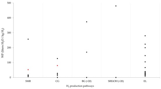 WF of H2 production systems. SMR: steam methane reforming; CG: coal gasification; BIO (SREtOH, SRBiogas, biogas gasification); EL: water electrolysis. Red points indicate studies that include blue, green, and grey water. Values of WF for BG and SREtOH should be multiplied by 20 times.
