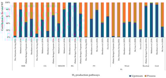 Several studies have analyzed the WF and WSF of H2 production systems (Figure 5). Since different methods and indicators were used, the results are not directly comparable. The methods applied for each study are listed in Table A2.